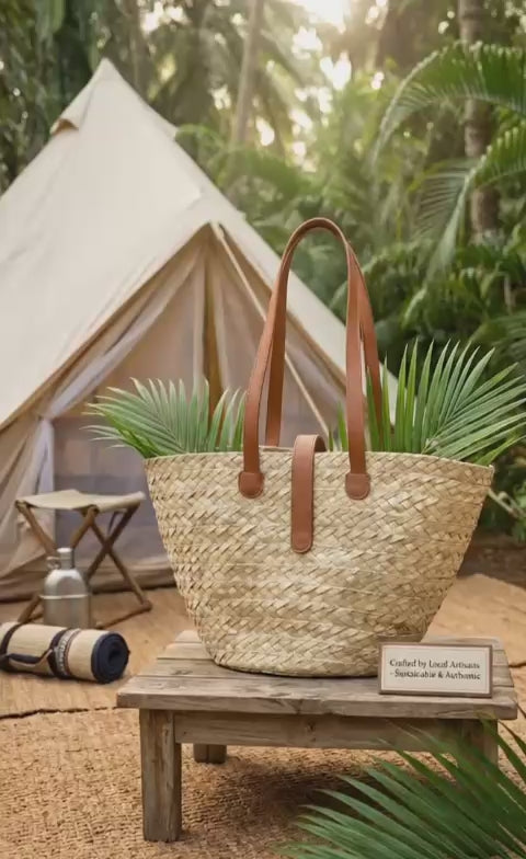 Step into sustainable style with our Eco Luxe Palm Leaf Tote, handcrafted by skilled artisans using natural tropical palm leaves.